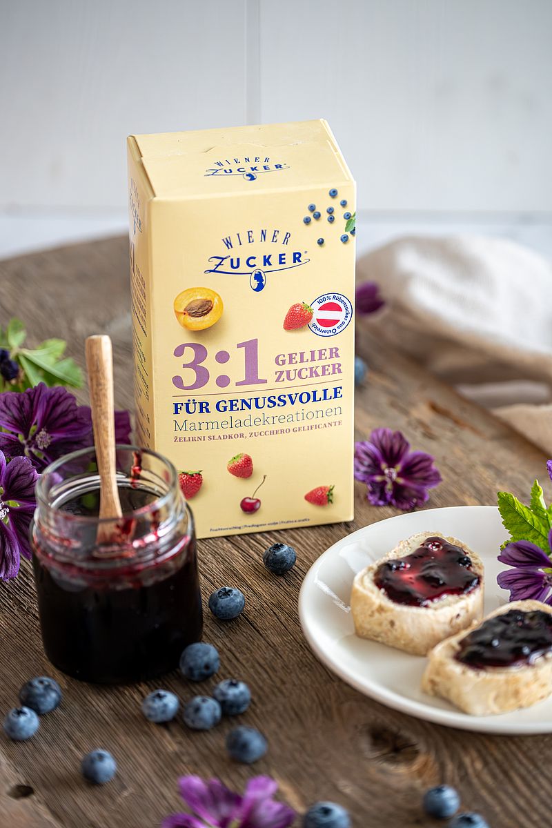 Tipp: Ein kleines Stamperl Calvados vor dem Abfüllen eingerührt - gibt der Konfitüre den letzten Pfiff. Mischt man anstelle der Äpfel Pfirsiche zu den Heidelbeeren, entsteht eine wohlschmeckende Konfitüren-Variante.