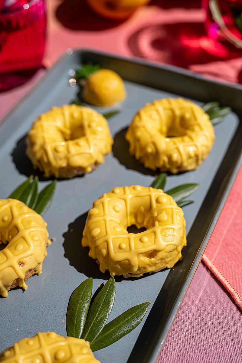 Donuts auf ein Kuchengitter stellen und Kuvertüre über sie gießen (Schokolade auffangen und wiederverwenden). Trocknen lassen. Restliche Schokolade in einen Einweg-Spritzbeutel füllen, Spitze abschneiden und als Gitter auf den Donuts auftragen. Zum Schluss noch kleine Punkte in die Quadrate spritzen. Zum Servieren einige Ananas-Blätter dazulegen.