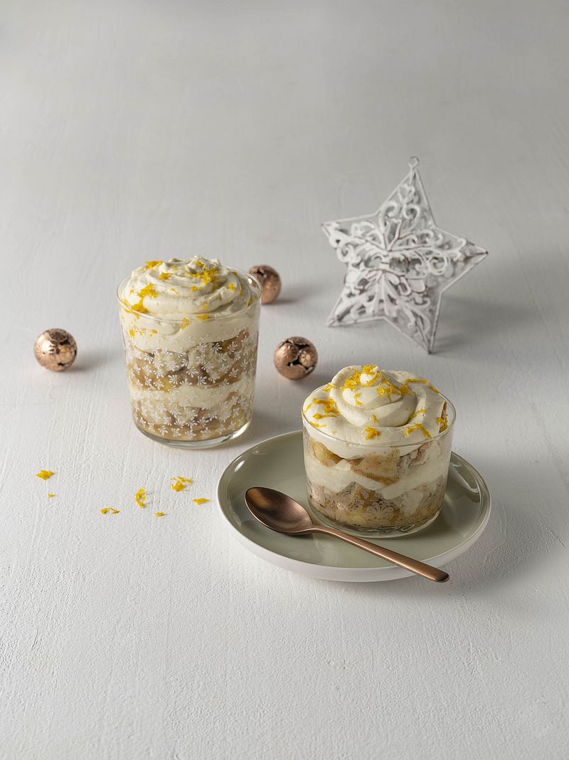 Das Dessert lässt sich wunderbar vorbereiten – am besten für ein paar Stunden im Kühlschrank durchziehen lassen. Mit Zimtstaub, Vanillekipferlbröseln, gehackten Nüssen oder ein paar frischen Beeren garniert servieren.